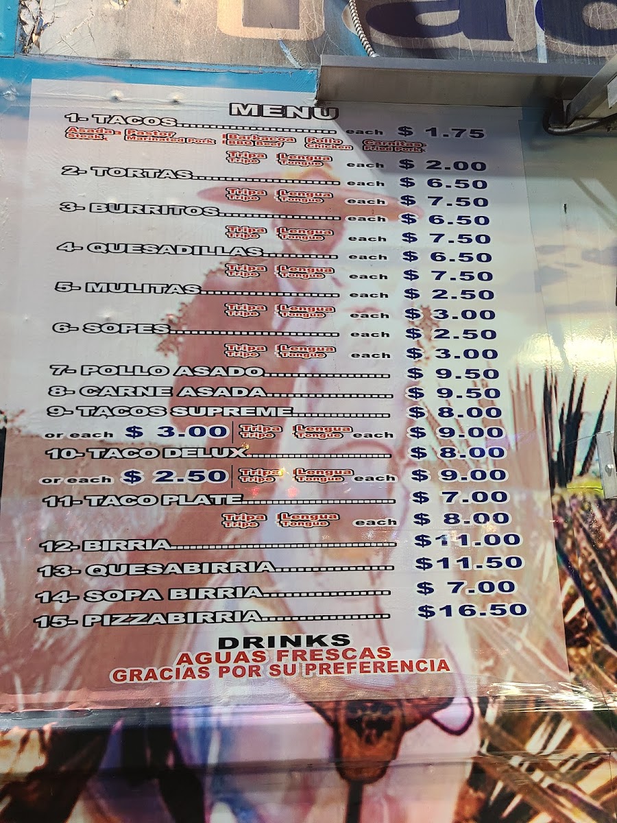 Welcome to Taqueria Agaveros, a hidden gem located at 2374 Old Fort Pkwy, Murfreesboro, TN. This vibrant taco truck serves up an array of mouthwatering offerings that are not just delicious but also made fresh to order. Dive into their Tacos Especiales, where options like Asada Steak, Pollo Chicken, and Pastor are available for just $1.25 each. For a heartier meal, try their Birria tacos or the unique pizza birria, both praised by loyal customers.